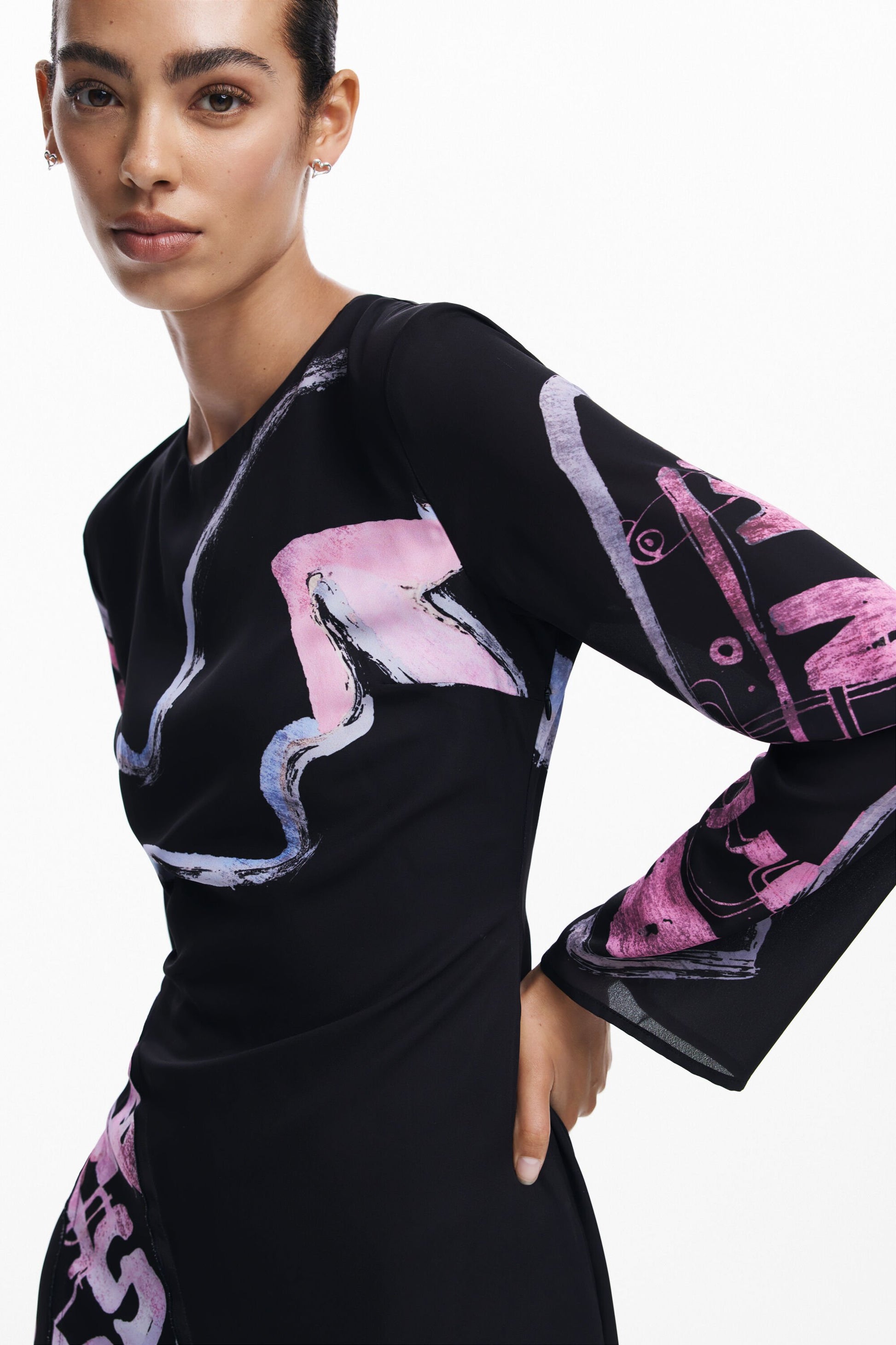 Vestido curto com saia assimétrica e mangas largas com estampa de letras e traços em cores vibrantes.