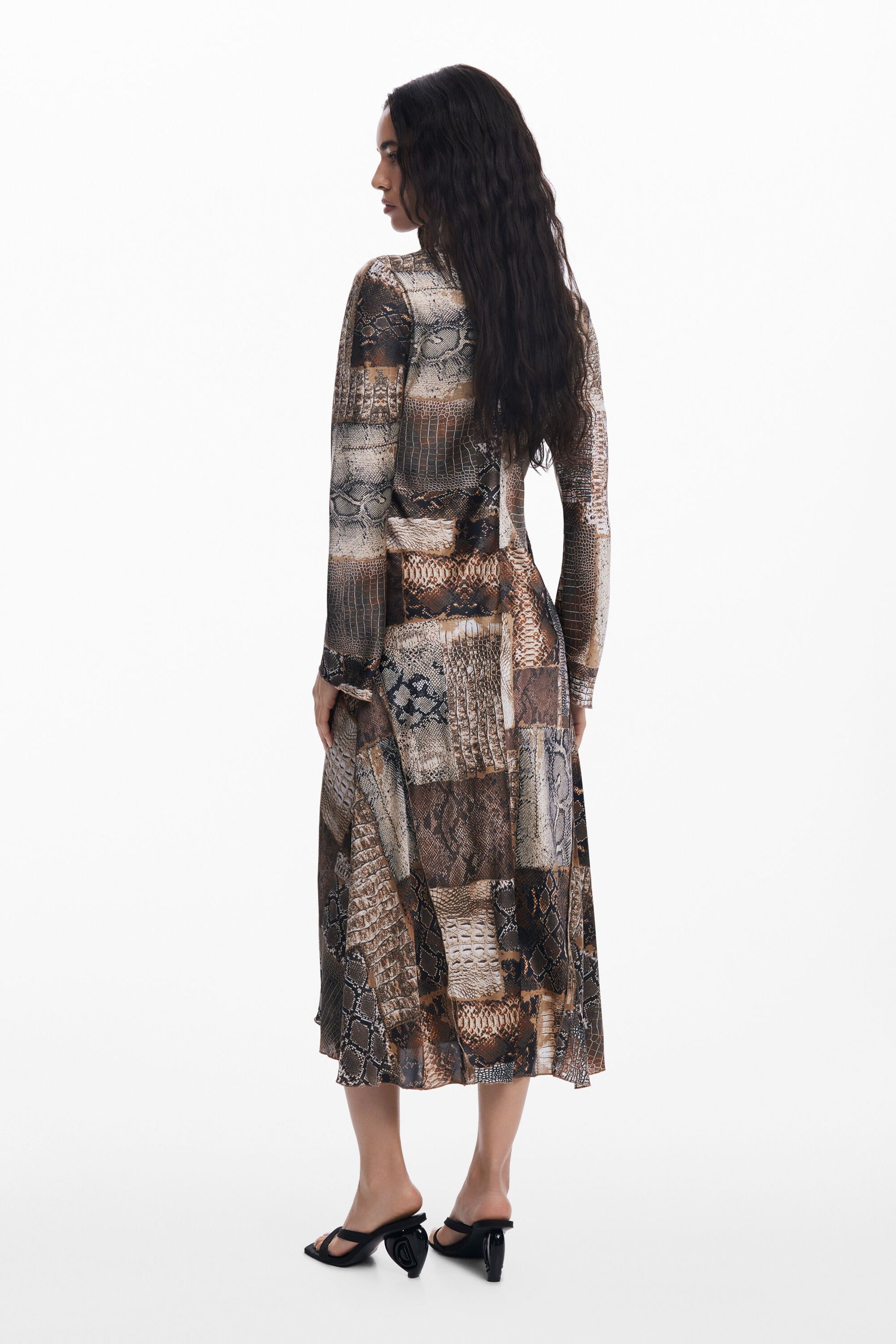 Vestido longo fluido, com decote redondo e manga longa com godês e estampa animal Arty.